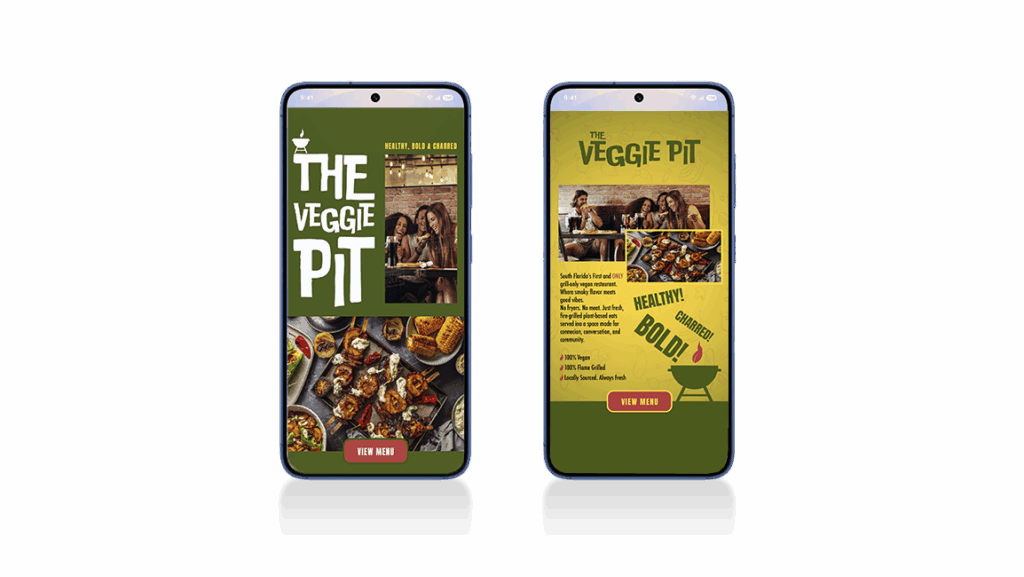 The Veggie Pit is a visionary vegan restaurant concept—the first of its kind in South Florida. The brand needed to capture the boldness of fire-grilled plant-based cooking while creating a social space for the vegan community. My goal was to build a high-energy identity that breaks clichés and puts grilled vegan food front and center in culture.
