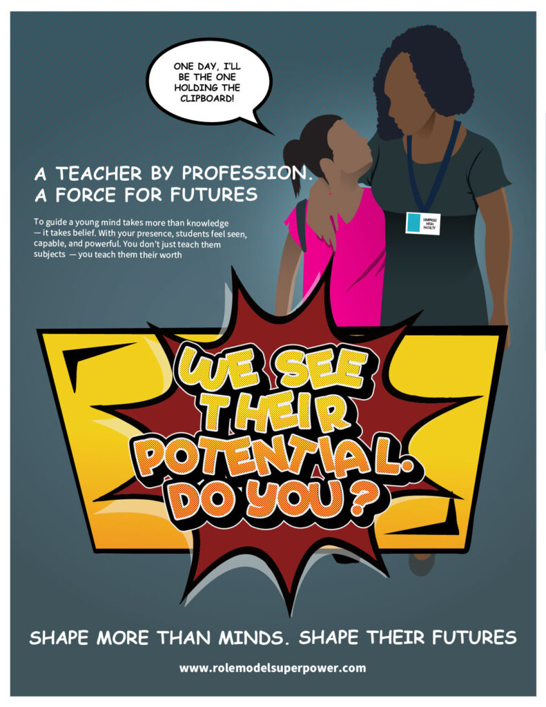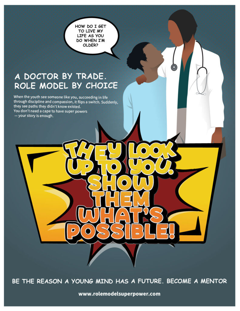 “Role Model is my Superpower,” is a mentorship awareness campaign that reframes everyday professionals—doctors, officers, teachers—as real-life superheroes for at-risk youth. Using a comic-inspired visual system and emotionally grounded illustrations, the campaign highlights small but powerful moments of guidance that shape a child’s future. The work combines narrative-driven imagery with clear, inspiring messaging to encourage community members to become mentors.